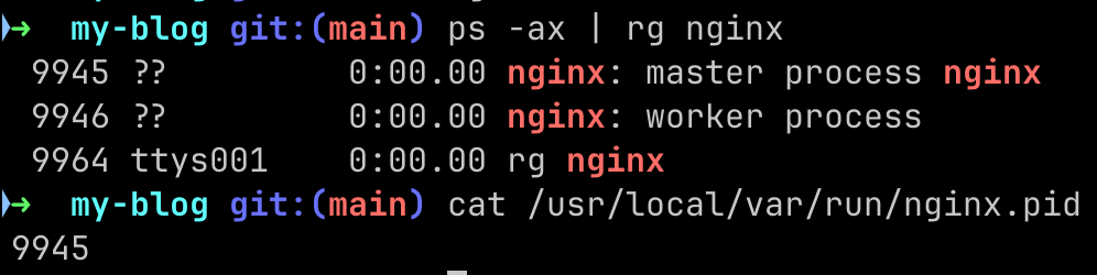 # 查看 nginx 主进程的 process ID $ cat /usr/local/var/run/nginx.pid 9738 # 优雅停机 $ kill -s QUIT 9738